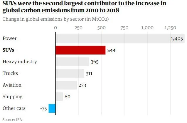 Car manufacturers have been actively worsening and profiting from the Climate Crisis through their promotion of SUVs. Credit: The Guardian & IEA