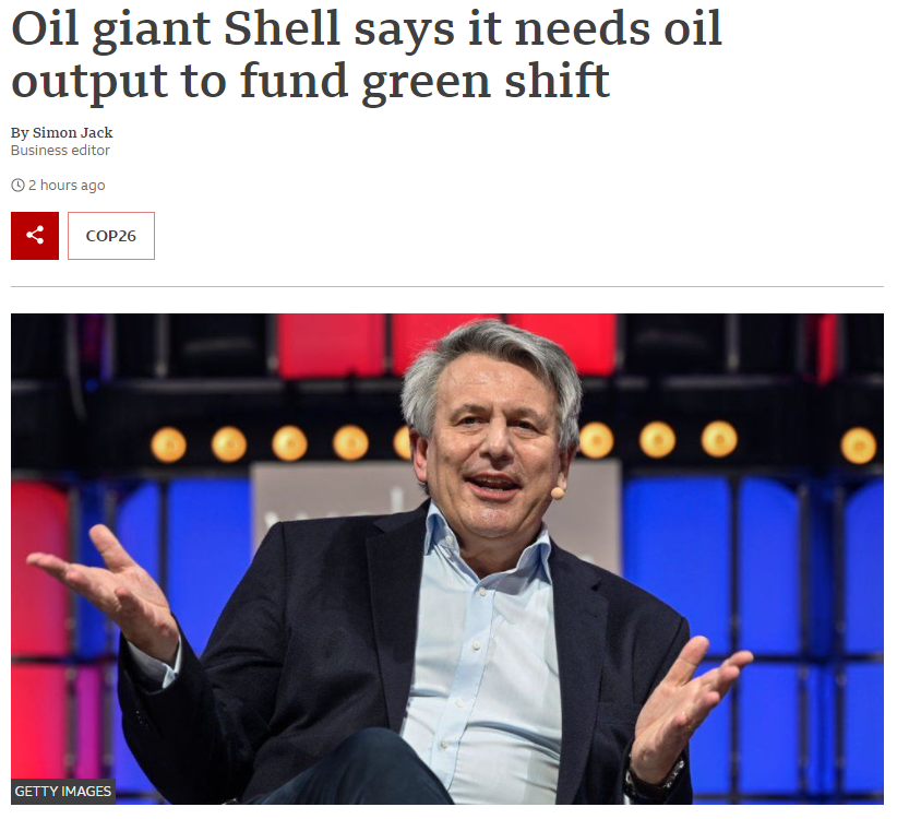 The answer: an interview with Shell CEO Ben van Beurden on the BBC with the headline “Oil giant Shell says it needs oil output to fund green shift”.