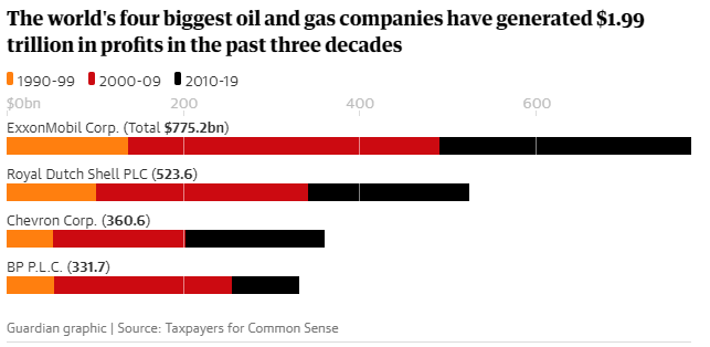 Graph showing the income of the world’s four biggest oil and gas companies generated between 1990-2019. Credit: The Guardian & Taxpayers for Common Sense